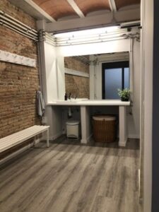L’espai està dividit en dues plantes; la planta de baix disposa de la secretaria, dos vestuaris, i un estudi amb llum natural, tarima flotant amb linòleum, barres mòbils, miralls i equip de so. També hi trobem un reformer per les classes de Pilates.