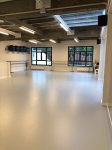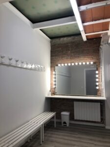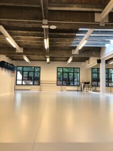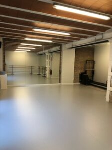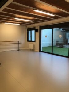 A la planta de dalt, hi tenim el segon estudi de 100m2 amb llum natural, barres mòbils, tarima flotant i linòleum, miralls, piano vertical i equip de so. També tenim material com fitballs, softballs, gomes, tacs, aros…